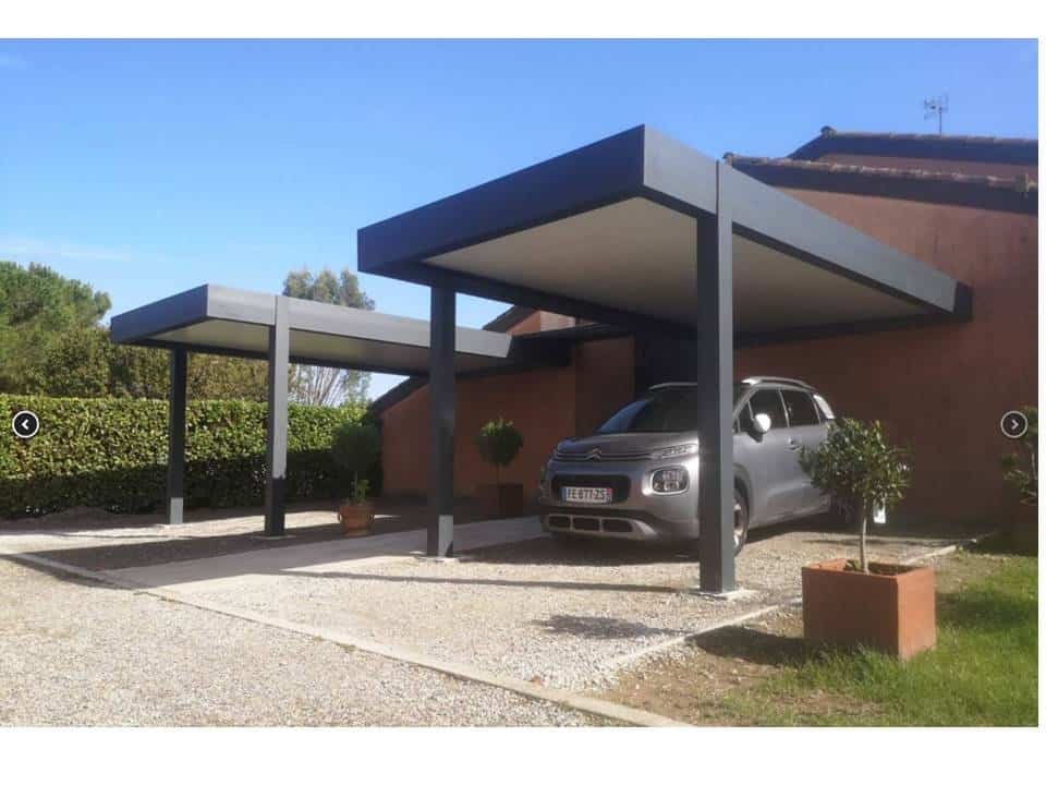 Les deux carports en aluminium de cette maison près de Toulouse, sont liés entre eux avec un auvent en aluminium qui renforce la protection au niveau de l’entrée de la maison.