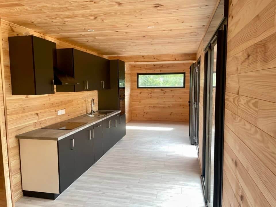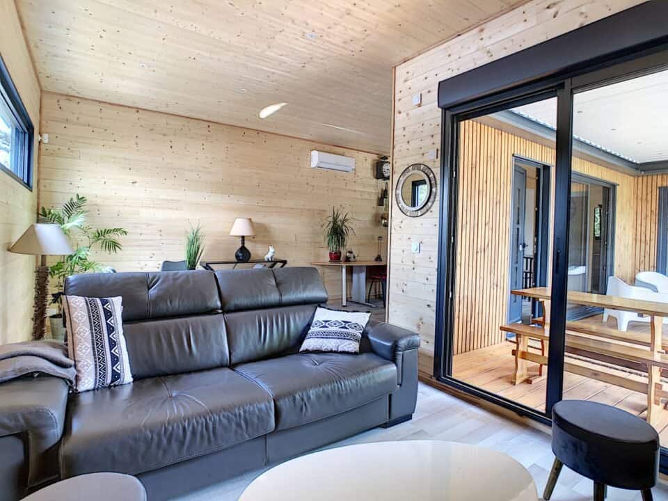 Ce chalet moderne CARRE2JARDIN de 50m2, crée et installé chez notre client au pied des Pyrénées sera utilisé comme résidence secondaire dans un 1ier temps et deviendra sa résidence principale prochainement. Un véritable chalet en bois, avec un agencement ouvert qui le rend agréable et lumineux. Meublé et décoré avec goût, il est équipé de toutes les commodités pour un séjour confortable, cuisine équipée , salle d’eau avec douche balnéo, salon et salle à manger. Les trois modules de ce studio donnent sur une belle terrasse de 25m2. La partie nuit avec une chambre pour deux personnes et sa salle d’eau, est aménagée à l’opposé du séjour, et donne également sur la terrasse par une baie coulissante.