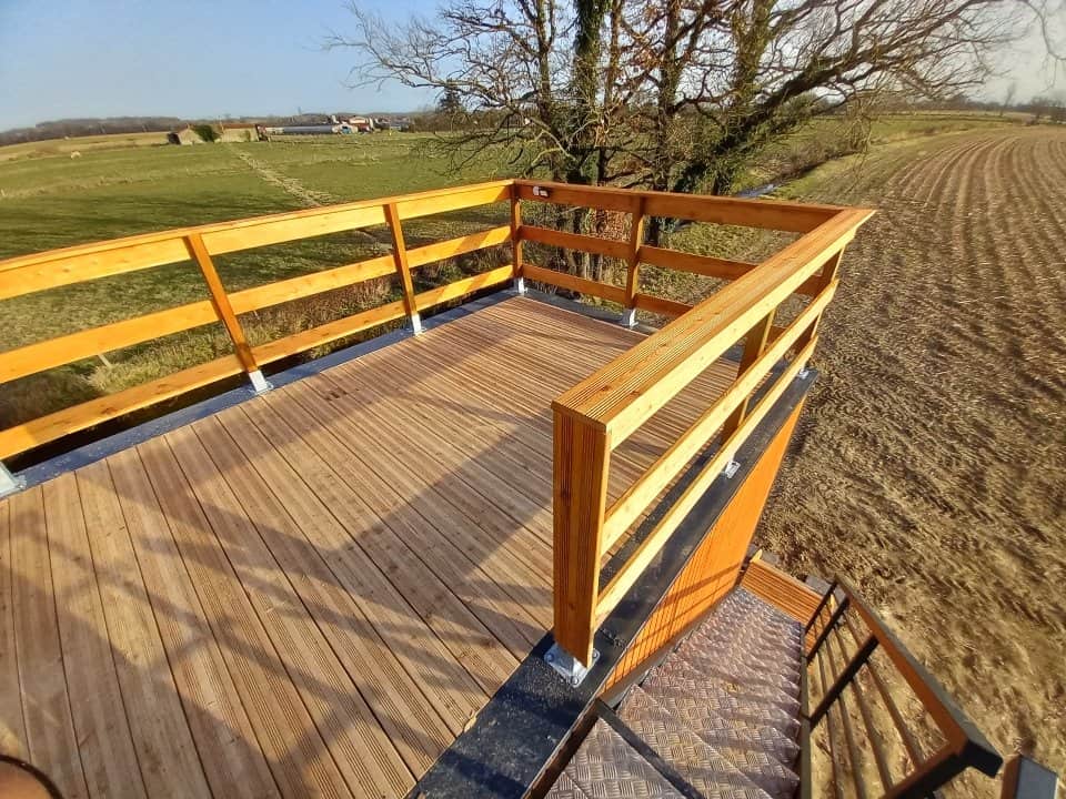 CARRE2JARDIN a réalisé pour son client habitant prés de Pau, un module bois tout équipé de 20m2 avec 1 chambre séparée, 1 salle de bain, 1 cuisine équipée et une accès sur toit terrasse avec escalier d’accès par l’extérieur et garde corps en bois Douglas.